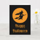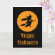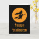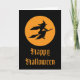 Eine Hexe, die vor Vollmond auf ihrem Besen fliegt.