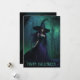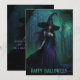 Senden Sie mit dieser skurrilen Halloween-Grußkarte, die ein digitales Bild einer verzauberten Hexe in Lila und Schwarz zeigt, ein spitzfindiges Lächeln im Hintergrund eines grünen, geheimnisvollen Nebelwaldes. Die Vorderseite der Karte zeigt das Kunstwerk mit der festlichen Nachricht "Happy Halloween". Auf der Rückseite finden Sie einen individuellen Gruß oder Halloween Wunsch. Es ist eine wunderbare und doch bezaubernde Art, den Halloween-Geist zu teilen. Ideal für Hexenliebhaber, Trick-oder-Leckerei-Spaß, saisonale Dekoration und Fans von bezaubernder gotischer Fantasie-Kunst.