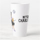 Eine Hexenmode-Abbildung. Niedliche Hexe, die auf einem Besenstiel mit ihrer orangefarbenen Katze auf Vollmond fliegt. Fügen Sie Ihren Namen zu dieser witzigen latten Tasse hinzu. Niedliches Halloween Hexendesign mit einer Orangenkatze. Wenn Sie im Oktober Gefühl witschig sind, dann ist dieses Design für Sie.