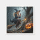 Eine Hexe, die beim sims auf ihrem Handy einen Besen fährt, kollidiert mit einem Baum in der Nähe einer glühenden Jack-o-Laterne.