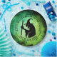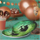 Papierteller mit einer schwarzen Silhouette einer alten Hexe, die einen Kessel auf schwarz-grünem Hintergrund umrüttelt, mit eigenem Text um die Hexe.