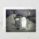 Ein niedliches Halloween-Bild. Eine kleine Hexe und ein Geist halten die Hände vor einem dunklen Hintergrund eines leuchtenden Mondes, beängstigenden Baumes und spukhaften Friedhofs. kleine rote Liebe-Herzen über ihren Köpfen.
