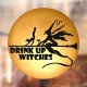 "Trink Hexen" mit einer Hexe auf einem Besen mit einer Katze und einem Martini über Vollmond.