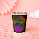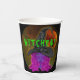 Trinken Sie Hexen Papier Cups Halloween-Party Tischdekoration. Design zeigt eine nächtliche Szene einer ungewöhnlichen Hexe mit rosa Haar und grünen Augen. Der Blutzond, der von hinten scheint, gibt ihr ein gruseliges orangefarbenes Glühen. Teil der Halloween-Hexenkollektion. Die Formulierung kann nach Belieben mit den Registerkarten "Personalisieren Sie diese Vorlage" oder "Design bearbeiten" geändert werden. Mit dem Reiter "Design bearbeiten" können Sie Stil, Größe und Farbe des Schriftartes ändern. Frohe Halloween!