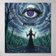 Dieses Poster präsentiert eine philosophische Erforschung von Power, Autorität und Wahrnehmung durch die Darstellung eines großen Auges, das auf Allwissenheit hindeutet, die an das "Auge der Vorsehung" erinnert. Unten steht eine einsame Figur in dunklen Roben, die eine Hexe oder Zauberin darstellt, die einen Sturm beherrscht und einen Konflikt zwischen individuellem Willen und äußeren Kräften symbolisiert. Die Phrase "NO KINGS" lehnt hierarchische Autorität ab und plädiert für dezentralisierte Ideale. Die künstlerischen Kontraste zwischen Licht und Schatten spiegeln Turbulenzen und den Kampf um die Entschlossenheit der Selbst wider, was zu der Betrachtung führt, wer im Kontext der Autorität beobachtet, befehligt und Widerstand leistet.