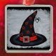 Traditioneller, schwarzer Hexenhut mit orangefarbenen Sternen und einem silbernen Schnürchen aus meinem Original. Eine niedliche, kleine mit Augen Spinne sitzt von der Spitze. Sehen Sie in meinem Shop Art by MAR nach, um Produkte mit diesem Design zu kombinieren.