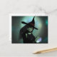Eine lächelnde, ganz schwarz gekleidete Hexe mit einem hohen schwarzen Hut wirft einen leuchtenden orbischen Zauber.