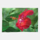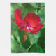 In diesem atemberaubenden Bild wird eine Blume des roten Hibiskus vor einem grün motbelten Hintergrund hervorgehoben.