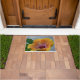 Eine Fußmatte für die Front Ihres Hauses, mit einer Fotografie einer gelben Hibiskus-Blume und des Wort Willkommens.