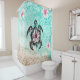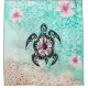 Ein stilisiertes Design aus einer Stammkröte mit komplizierten Mustern steht auf einem türkisfarbenen Hintergrund, umgeben von zarten rosa Hibiskus-Blume. Die Szene erinnert an ein fröhliches Strandgefühl mit einer Mischung aus naturlich inspirierten Elementen.