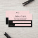 Front: Diese Vorlage mit blass rosa und schwarz zeigt Text, den Sie bearbeiten können. Oben ist schwarzer Bildschirmtext auf einem blassrosa Streifen. Sie können den Anzeigetext bearbeiten, um eine benutzerdefinierte Nachricht freizugeben, falls gewünscht (angezeigt: Freundschaftswerbung anzeigen). Unter dem großen Text können Sie den Text ändern, um die Bedingungen Ihres Angebots zu enthüllen. Unten ist ein schwarzer Streifen, der Kästchen zum Schreiben des Freundes und des Namens des Kunden enthält, der die Empfehlung abgegeben hat. Zurück: Oben befindet sich ein Display, das durch das entsprechende Logo ersetzt werden kann. Unten sehen Sie einen rosa Bildschirmtext für Ihre Kontaktinformationen. Alle Texte können bearbeitet oder gelöscht werden.