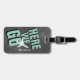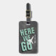 Humorvolle Botschaft HIER WIR GEHEN in einem kühlen Schriftart Stil, mit dem Bild eines Flugzeugs, personalisiert mit dem Namen des Reisenden... um Ihre Habe zu identifizieren, und Reisen in Stil... und eine schöne Reise...