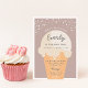 Mit diesen festlichen Eis-Einladungen in einer sanften Pastellfarbenpalette verkünden Sie Ihre Geburtstagsfeier Ihres Kleinen. Das moderne Design umfasst einen Waffelkegel mit einer Kugel Vanilleeis mit einem Gewölbe "Hier ist die Kugel" über der Oberseite, und die Details der Geburtstagsparty Ihres Kindes auf einem rosa Taupe Hintergrund.