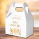 Diese niedliche Babyduschbox mit Sonnenschein zeigt eine Aquarellillustrierung einer gelben Sonne und "Here kommt the Son" in stilvoller Retro-Typografie. Ideal für eine Babydusche. Einfach anpassbar. Original Wasserfarbe © Michele Davies.