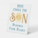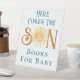 Dieses Baby Shower Pedestal Schild ist mit einer gelben Aquarellfarbe ausgestattet, die die Sonne lächelt und "Here Comes The Son" in blauer Typografie. Original Wasserfarbe © Michele Davies.