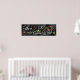 Ein Hochzeitsbanner "Here Comes The Bride" in Kalligraphie-Schrift mit orangefarbenen Blume und Grün über einem schwarzen Aquarellhintergrund.