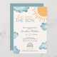 Spaß und niedliche Babydusche Einladung "Here Comes the Son" mit Aquarellwolken, Sonnenschein und Regenbogendesign.