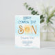 Die Babydusche dieses niedlichen Jungen ist mit dem Text "Here Comes The Son" in blauer Retro-Typografie mit gelber Aquarellsonne, Wolken und Himmel ausgestattet. Einfach anpassbar. Weil wir unsere Kunstwerke erstellen, werden Sie dieses exakte Bild von anderen Designern nicht finden. Original Wasserfarbe © Michele Davies.