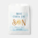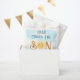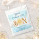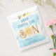 Die Babyduschtüte dieses niedlichen Jungen enthält den Text "Here Comes The Son" in Retrotypografie mit einer lächelnden gelben Aquarellsonne und blauem Himmel. Einfach anpassbar. Weil wir unsere Kunstwerke erstellen, werden Sie dieses exakte Bild von anderen Designern nicht finden. Original Wasserfarbe © Michele Davies.