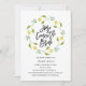Dieses Design zeigt einen blauen und gelben Blumenkranz, der den Satz "Hier kommt die Braut" umgibt. Nächste Hochzeitsdetails sind unten und können individuell angepasst werden. Graphics ©Huckleberry Hearts