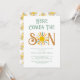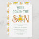 Mit dieser sonnengefleckten Baby-Dusche laden Familie und Freunde zur Babydusche ein. Es enthält den Text "Here Comes The Son" in grüner Retro-Typografie mit einer gelben Aquarellsonne. Die Rückseite ist mit einem Sonnenmuster dekoriert. Einfach anpassbar. Original Wasserfarbe © Michele Davies.
