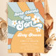 Retro Baby Shower Einladung mit einem boho sonnendurchfluteten blauen Hintergrund , verstreuten kalte Blume, Regenbogen, und die Worte "hier kommt der Sohn" in einem großartigen 70er Schriftart. Dreh unsere süße Einladung, um einen koordinierenden blauen Rücken zu sehen.