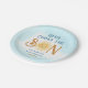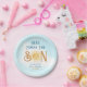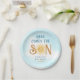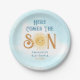 Die Babydusche-Papier-Teller des niedlichen Jungen sind mit dem Text "Here Comes The Son" in stilvoller Blau- und Brauntypografie mit gelber Aquarellsonne und blauem Himmel versehen. Einfach anpassbar. Original Wasserfarbe © Michele Davies.