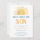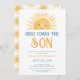 Mit dieser niedlichen Sonnendusche laden Familienmitglieder und Freunde zu einer sonnigen Babydusche ein. Es enthält den Text "Here Comes The Son" in stylish blauer Typografie mit einer niedlich gelben Aquarellsonne. Der Rücken ist mit einem sonnigen Muster dekoriert. Einfach anpassbar. Original Wasserfarbe © Michele Davies.