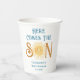 Diese Baby-Duschpapiertassen haben den Text "Here Comes The Son" in blauer Retro-Typografie mit einer niedlichen gelben Aquarellsonne. Einfach anpassbar. Weil wir unsere Kunstwerke erstellen, werden Sie dieses exakte Bild von anderen Designern nicht finden. Original Wasserfarbe © Michele Davies.