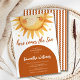 Feiern Sie Ihre kleine Sonne mit dieser gemütlichen "Here Comes the Sun" Baby Dusche in warmen Herbsttönen. Das Design besticht durch eine Lächelnde Sonne, Terrakotta- und Karamellakzente und spielerische Boho-Streifen - perfekt für eine Babydusche im Herbst, ein Kürbisbaby oder ein "You Are My Sunshine"-Fest. Personalisieren Sie Ihre Daten einfach online und erstellen Sie einen schönen gedruckten Sake, der Wärme und Freude ausstrahlt.
