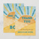 Einzigartige Watercolor Sonnenschein-Thema Baby Dusche Danke Karte mit Titel " Here kommt the Son" in den Farben Gelb, Blau und Burnt Orange.