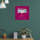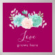 Ein Poster mit einigen inspirierenden Worten: Liebe wächst hier. Geschrieben auf einem magentafarbenen Hintergrund. Ein pastellfarbener Blume-Bouquet oben. Die Blume, Blätter und Krabben sind pastellrosa und grün. Erstellt mit Aquarellfarbe und digitalisiert. Schön und aufregend.