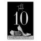 Elegante Glam Silver und Black High Heel Stiletto Shoe Tischnummer Card mit trendigem und modernem Design und Schriftart, perfekt für ihre Geburtstagsparty, Brautparty, Mode Business Event, Sweet 16, Quinceanera, Fledermaus Mitzvah oder jedes Party feiern Luxus und Spaß mit einem High Heel Pump Schuhthema.