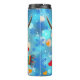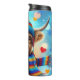 The background is a crisp and cool winter wonderland with an icy blue and white bokeh effect. The scene is framed by various decorative blue and white snowflakes and accented with cheerful red and orange hearts, creating a cozy yet playful aesthetic. This design is perfect for winter-themed merchandise, including mugs and tumblers, appealing to those who love cute animals and bright, cheerful colors.