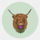 Ein Porträt einer auburn haarigen schottischen Hochlandkuh. Eine schottische Dickel mit grünen keltischen Knoten Arbeit ist vor der Kuh gehen.
