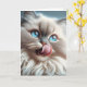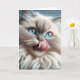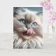 Eine flauschige Katze aus dem Himalaya mit leuchtend blauen Augen wird gefangen, die ihre Nase zum lustigen Geburtstag leckt. Alle Texte können geändert werden.