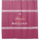 Trendy Dekorhimbeerfarbe irgendein Art-Zuhause-Duschvorhang. Familienstrandhaus oder irgendein Ferien-Zuhausemonogramm, korallenrote Farbmonogrammskriptinitiale mit weißer mutiger Typografie und Spitze/unteren Streifen. Benutzen Sie einfach die Funktion "personifizieren dieser Schablone", um Ihren Familiennamen einzufügen, Initiale und das hergestellte Datum und die Zuhauseart.