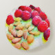 Ein Foto von digital verändertem Foto von Mandeln und Himbeeren. Das Foto wurde mit einem Aquarellfilter versehen. Dieses Design ist auf der Abdeckung der beiden Seiten dieses runden Kissens zu sehen. Verlass es wie besehen oder klicke auf Anpassen, um Text wie einen Familiennamen hinzuzufügen. Bei Bedarf können Sie auf beiden Seiten auch eine andere Hintergrundfarbe als Grün auswählen.