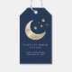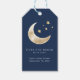 Vervollständigen Sie Ihre Babyshower-Geschenke mit diesen eleganten himmlischen Anhängern. Mit einem goldenen Halbmond und funkelnden Sternen vor einem tiefblauen Wasserfarbhintergrund verleiht jeder Anhänger Ihrer Feier eine träumerische Note.