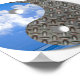 Ursprünglicher blauer Himmel mit reinen weißen Wolken gegen industrielles Metall. Das Leben ist voller Gegensätze, und dieses Design behalte sie in Perspektive.