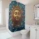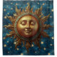 Vor einem sternenklaren himmlischen Hintergrund das serene Gesicht einer stilisierten goldenen Sonne.
