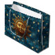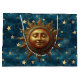 Vor einem sternenklaren himmlischen Hintergrund das serene Gesicht einer stilisierten goldenen Sonne.