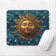 Vor einem sternenklaren himmlischen Hintergrund das serene Gesicht einer stilisierten goldenen Sonne.