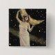 Vintage Fotografie, die eine reizende Dame im langen Kleid stehend in einer drastischen Pose vor einem sichelförmigen Mond zeigt.