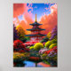 Entdecken Sie ein Stück Paradies als eine große japanische Pagode inmitten einer atemberaubenden Ausstellung atemberaubender Flora. Der Himmel oben ist mit rosa Wolken geschmückt, die ein ruhiges und traumhaftes Ambiente ausstrahlen. Verlieren Sie sich in dieser Oase der Schönheit, wo Pagode und Natur in perfekter Eleganz harmonieren.