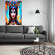 Ich fragte die KI, ein Portrait der Hindu-Göttin Kali zu machen, hier mit heller Haut, blauen Haaren und Augen und einem einzigartigen Haarstück auf dem Kopf mit einem rot-blauen, flammenfarbenen Hintergrund. Das ist eine künstlerische KI.
