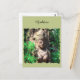 Postkarte mit einer hübschen Göttin, umgeben von Bäumen und Grünpflanzen im Dschungel.
