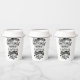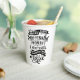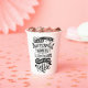 Diese heiße Getränketasse enthält kokalige Handschrift, in der steht: "Hinter jeder Frau ist eine beträchtliche Menge Kaffee." auf weißem Hintergrund. Die Schrift enthält dekorative Wimpern und dekorative Wirbel.