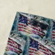 Dieses amerikanische Fahnenbild wird dagegen hervorgehoben, Feuerwerk platzt, in einer farbenfrohen Darstellung von rot, weiß, blau und gelb, Fackeln - in einem wolkigen, dunkelblauen Himmel.