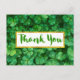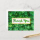 Eine Postkarte mit frischem Frühjahrsdesign, das ein Fach von Kleeblatten in einem üppig grünen Grün zeigt. Vielen Dank, dass Sie in der Mitte auf einem weißen Rahmen mit einem IMITAT goldenen Rahmen geschrieben haben.